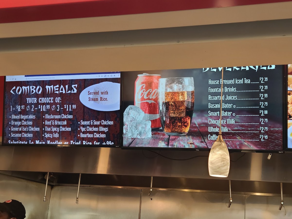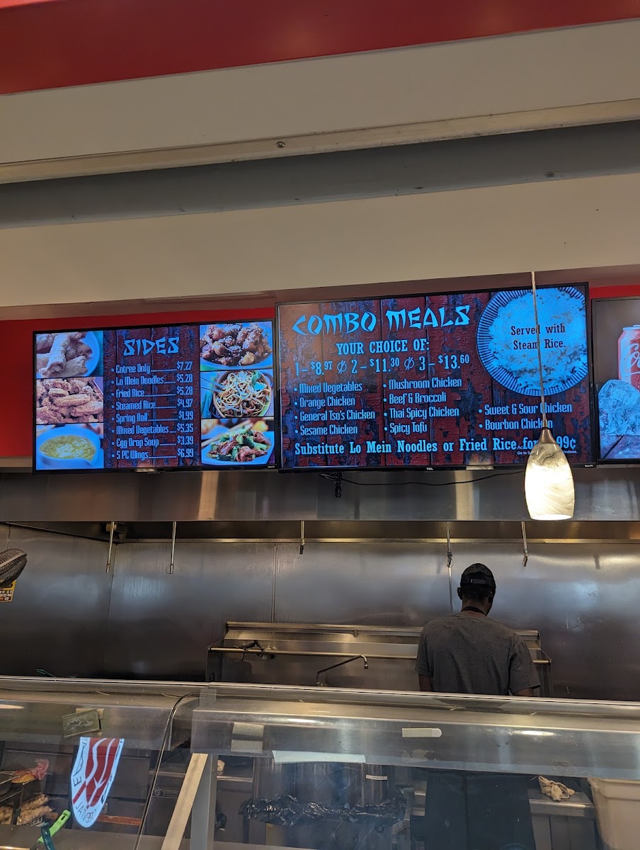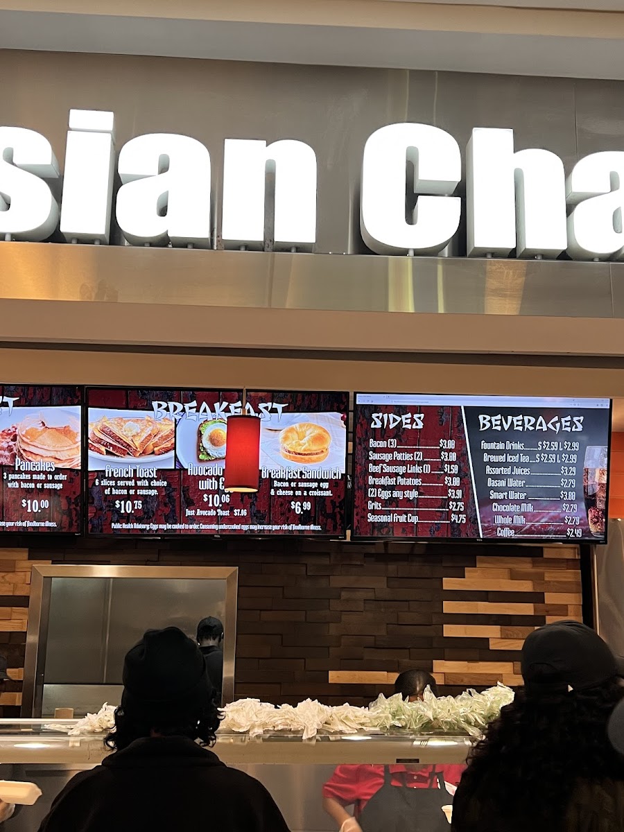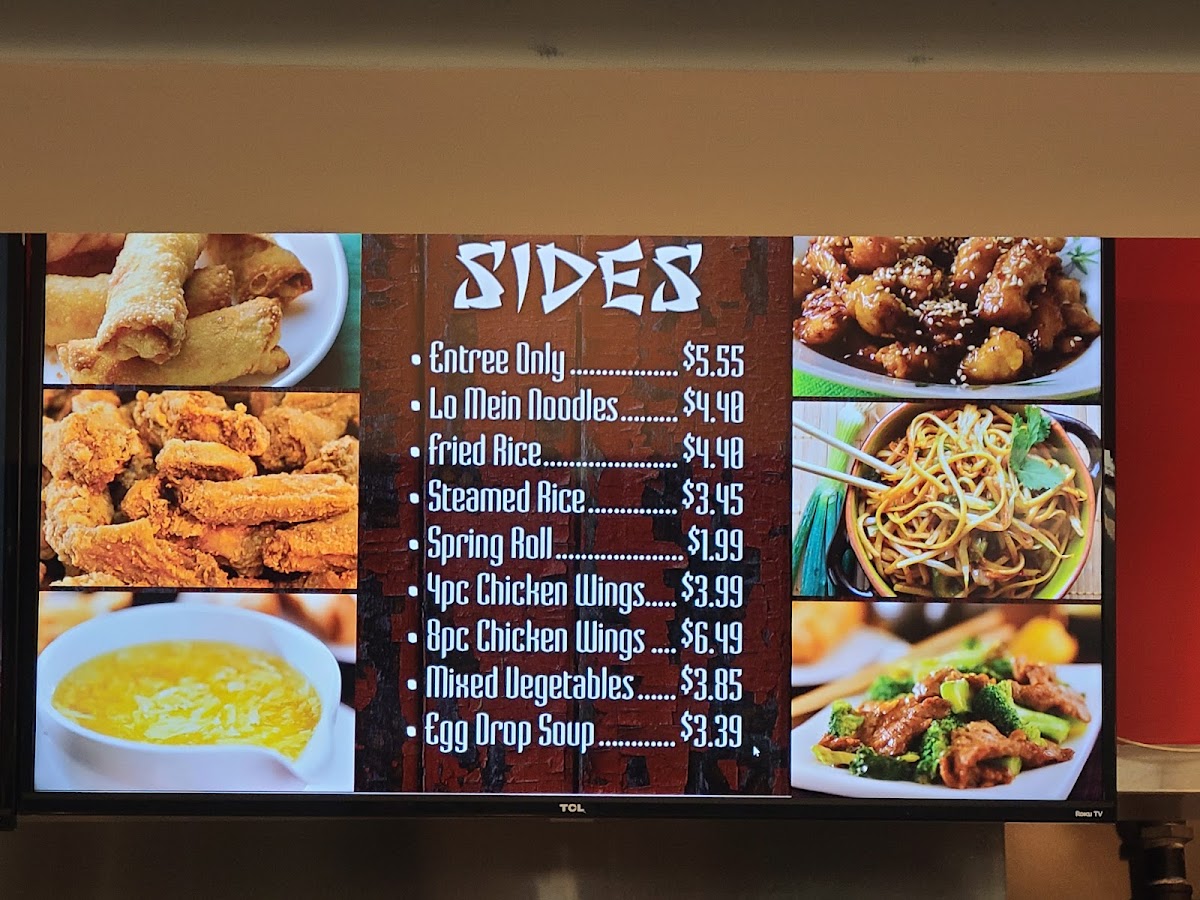Main Entrées and Sides: Guests can choose from popular Asian dishes such as Beef & Broccoli, Sweet & Sour Chicken, Bourbon Chicken, General TSO, Orange Chicken, and Lo Mein. Sides include items like Fried Rice and 5-piece Wings, providing complementary options for a complete meal.